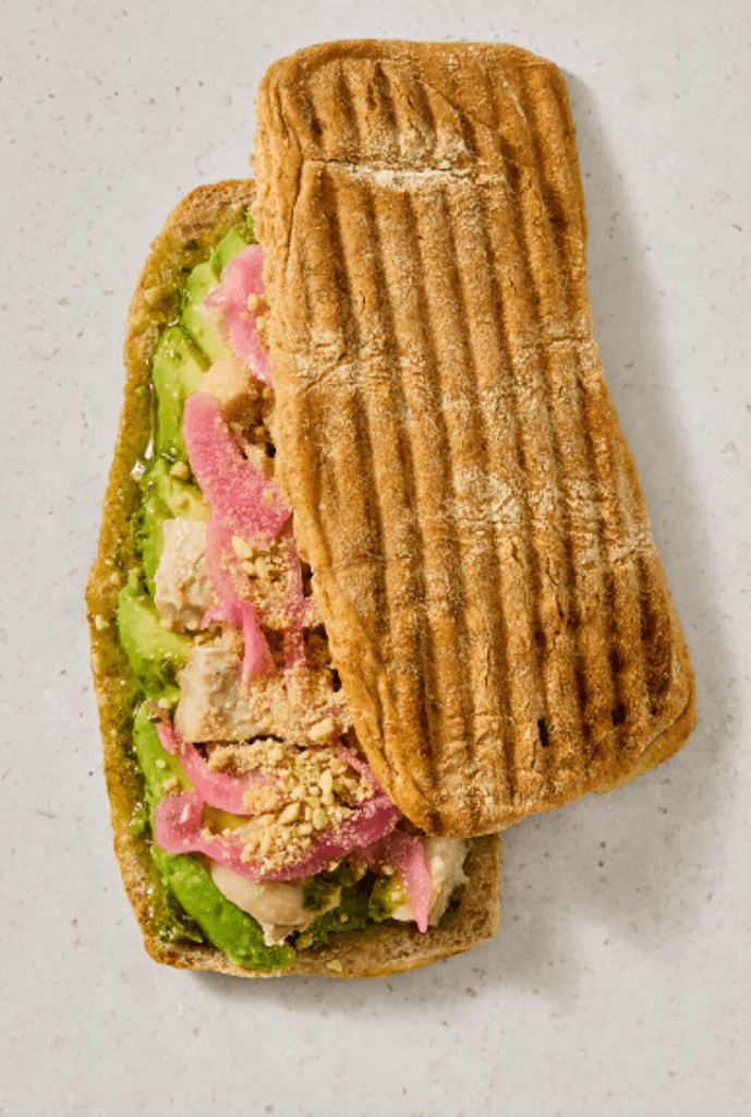 En cafe-favoritt! En sprø sandwich med kylling, nøtteparmesan og kremet avokado. Perfekt til frokost, trening eller jobblunsj!